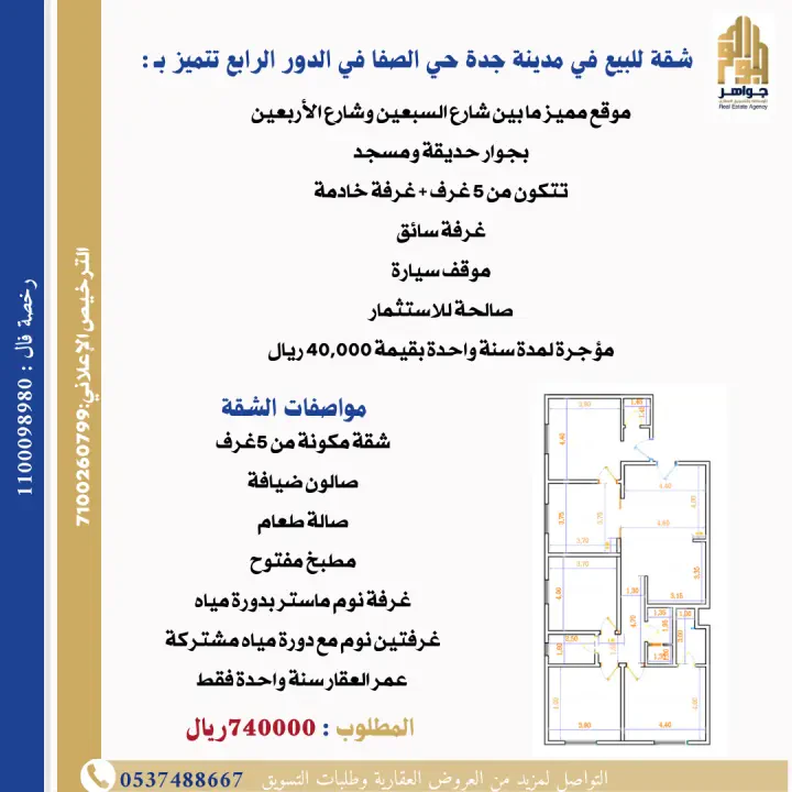 شقة فاخرة للبيع بمدينة جدة / حي الصفا … بموقع استراتيجي مميز ما بين شارع السبعين وشارع الأربعين، بجوار حديقة ومسجد، في بيئة سكنية هادئة ومخدومة.