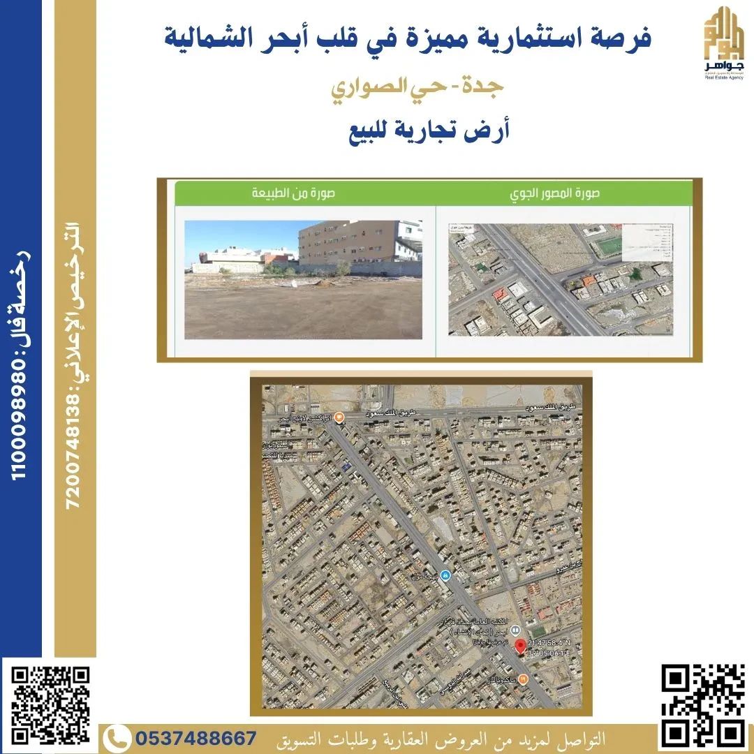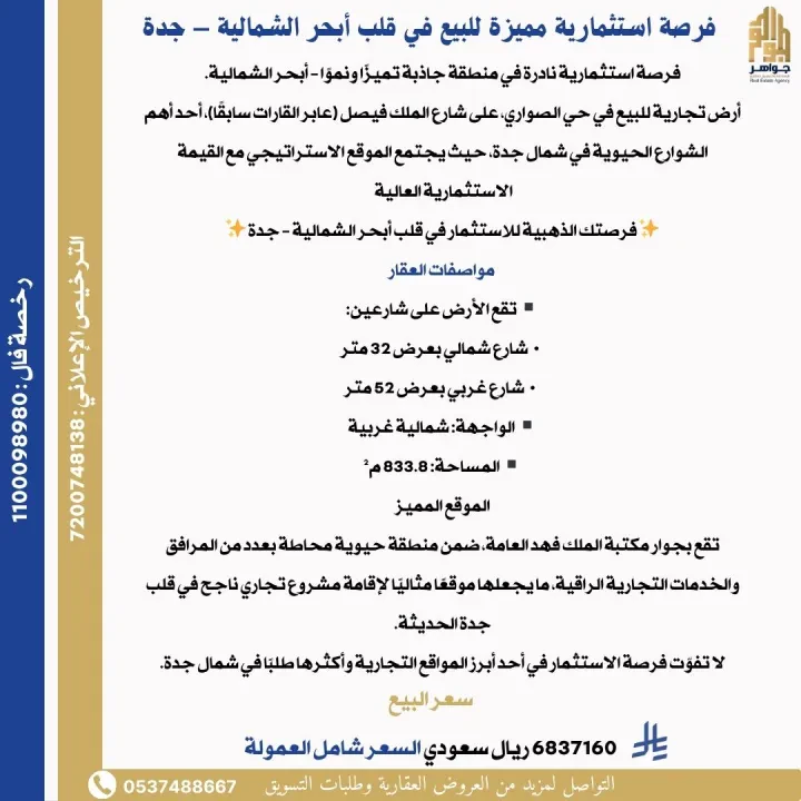 فرصتك الذهبية للاستثمار في قلب أبحر الشمالية – جدة 📍 مواصفات العقار: ▪️ تقع الأرض على شارعين: • شارع شمالي بعرض 32 متر • شارع غربي بعرض 52 متر ▪️ الواجهة: شمالية غربية ▪️ المساحة: 833.8 م² الموقع المميز: تقع بجوار مكتبة الملك فهد العام