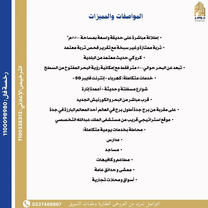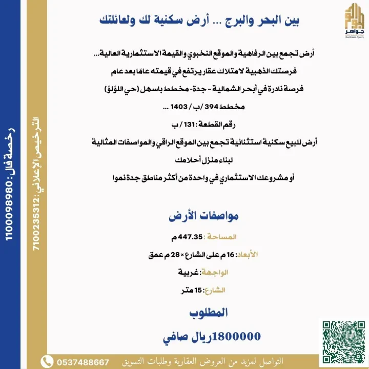 أرض مميزة جداً للبيع في مدينة جدة / أبحر الشمالية ▪️في مخطط باسهل (حي اللؤلؤ) وهو أحد أرقى أحياء أبحر الشمالية: - مساحتها - ٤٤٨م٢ - على شارع عرض ١٥ م - ابعادها (١٦م عرض على الشارع x ٢٨م عمق للداخل) - واجهة غربية - مطلة مباشرة على ح